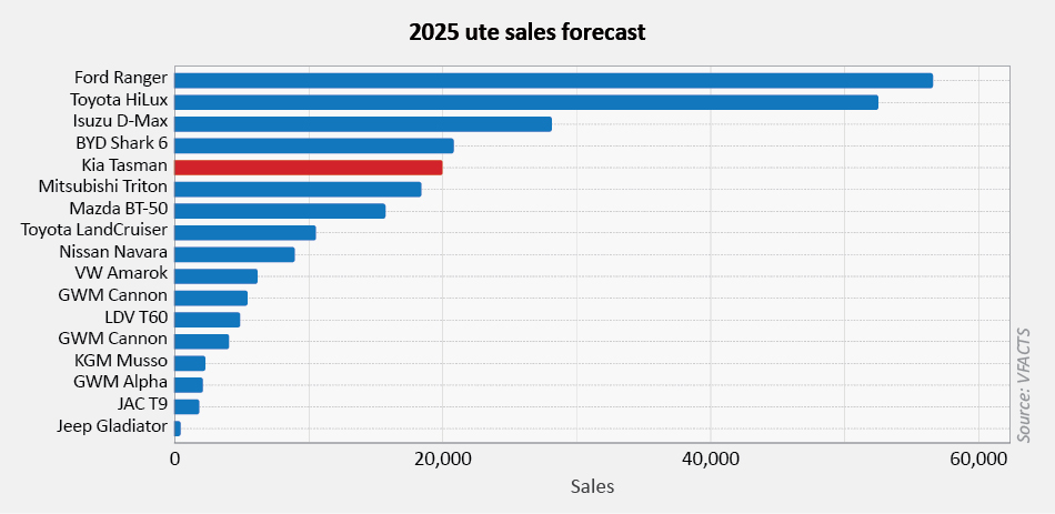 Based on segment results to June 2025, an annual Tasman result of 20,000 sales would see it land in fifth place, behind the Ford Ranger (53,342 annualised run rate), Toyota HiLux (44,490 ARR), Isuzu D-Max (21,912 ARR) and BYD Shark 6 (20,848 ARR), but ahead of the Mitsubishi Triton (16,414 ARR).